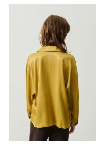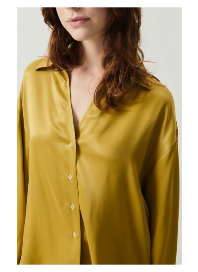 La chemise est fabriquée dans une matière fluide et satinée qui capte la lumière avec élégance, offrant un effet brillant et une sensation agréable au toucher.