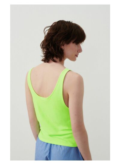 Quelle est la coupe et les détails du débardeur ? Il présente une coupe droite avec des bretelles fines et un col rond, confectionné en jersey fin et reliéfie avec un traitement vintage pour un look authentique.