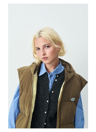 Quels sont les détails pratiques de cette doudoune ? Elle est sans manches, dotée d’une capuche classique, d’une fermeture zippée et de deux poches passepoilées pour ranger vos essentiels en toute sécurité.