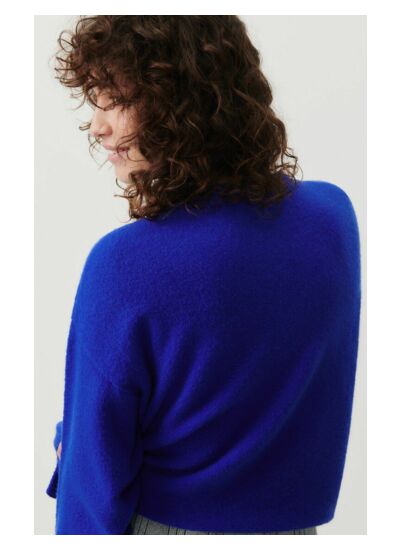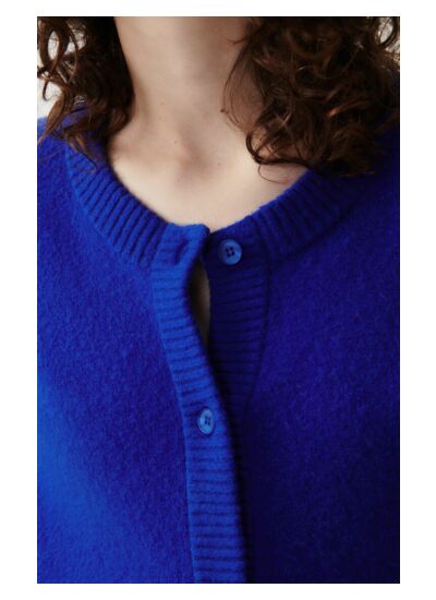 Le gilet Damsville se distingue par sa fermeture à boutonnière avec des boutons marbrés et ses bords côtelés, alliant élégance et confort dans une coupe oversize tendance.