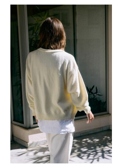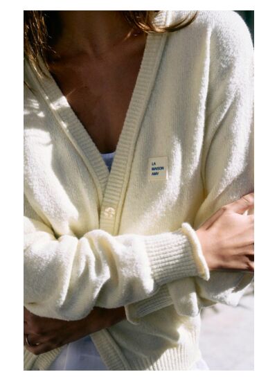 Le gilet Dylbay pour femme revisite la maille estivale dans une version courte et ample, à la coupe boule. Avec ses manches longues et son col V boutonné, il allie confort et style dans un esprit seconde main affirmé. Tricoté dans un mélange de fils italiens, il séduit par sa texture douce, souple et légèrement moelleuse. À porter sur une robe ou un top, pour une silhouette féminine, décontractée et contemporaine.