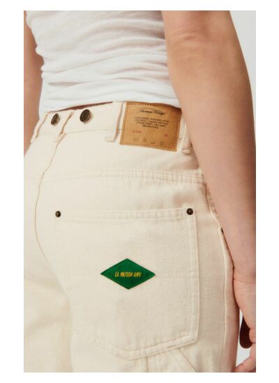 Le patch logo "La Maison AMV" sur la poche arrière, les cinq poches fonctionnelles et la braguette à zip avec bouton renforcent son identité workwear et son authenticité American Vintage.