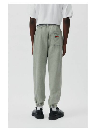 Le jogging est réalisé en toile de denim bleu, alliant l’aspect authentique du jean à la souplesse d’un pantalon de jogging, pour un look casual et moderne.