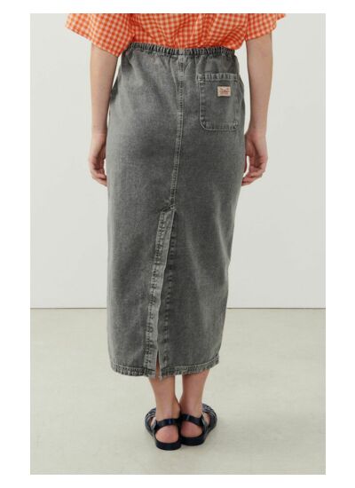 Quel type de tissu est utilisé pour la jupe Jazy ? Cette jupe est conçue en denim fin et souple, offrant légèreté et aisance tout au long de l’année, avec un délavage gris qui apporte une touche moderne.