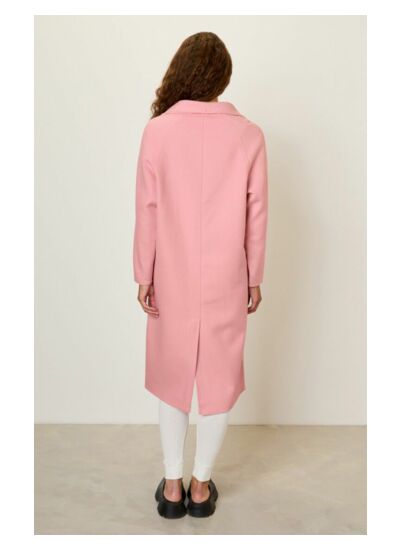 La fermeture se fait par une boutonnière discrète qui maintient la coupe droite et épurée du manteau.