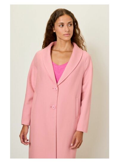 Le manteau Dadoulove présente une coupe droite et longue avec un col châle, offrant une silhouette élégante et intemporelle.