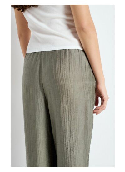 Quelle matière compose ce pantalon ? Il est confectionné dans une matière légère, fluide et texturée avec un aspect irrégulier et légèrement irisé, offrant un équilibre entre structure et fluidité.