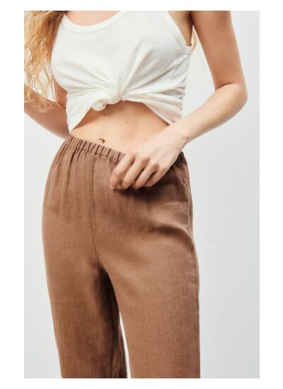 Le pantalon est confectionné en lin, une matière souple et légère qui assure confort et respirabilité, idéale pour les températures estivales.