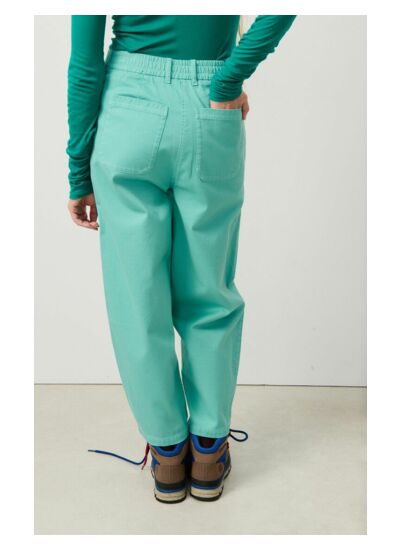 Il présente une taille haute avec une jambe arrondie et large, ainsi qu’une fourche basse, offrant une silhouette contemporaine et une grande liberté de mouvement.