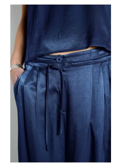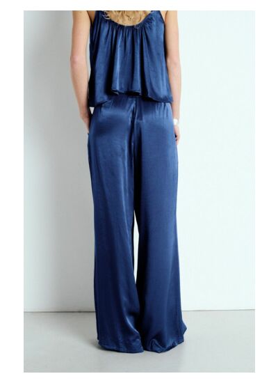 Le pantalon est conçu dans une matière fluide et lumineuse avec une armure satinée, offrant une sensation soyeuse et une belle tenue. Cette composition assure confort et élégance, idéale pour les soirées chaudes.