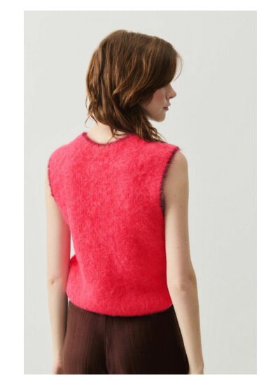 Le pull sans manches Bymi se porte idéalement superposé sur un t-shirt à manches longues pour un effet layering tendance. Il peut aussi se porter seul pour un look minimaliste chic, grâce à sa maille douce et son esprit rétro.