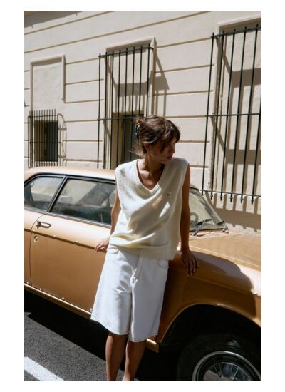 Le pull sans manches Dylbay adopte une coupe ample et boule, avec un col V dégagé qui évoque un esprit casual et décontracté. Tricoté dans un mélange de fils italiens au toucher doux et moelleux, il offre une maille d’été souple et agréable à porter. Son look estival et son allure rétro rappellent l'esprit seconde main, pour une pièce facile à associer à un pantalon en denim ou un bermuda.