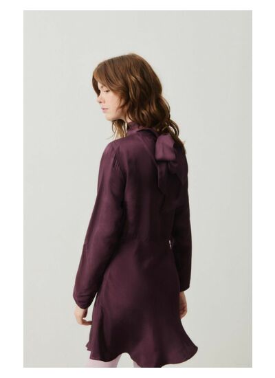 La robe est confectionnée dans une matière fluide à l’aspect satiné, offrant une sensation légère et un tombé élégant qui souligne la silhouette.