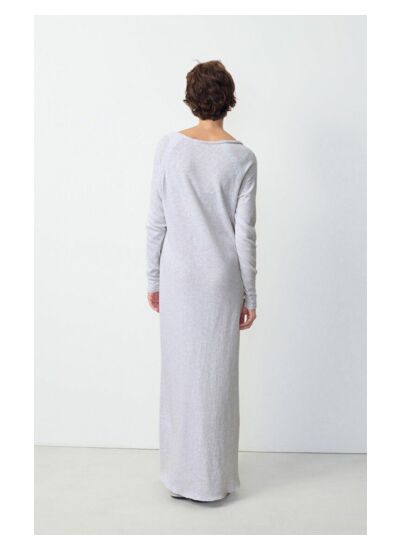 La robe présente une coupe droite et longue avec des manches longues et une encolure bateau, offrant une silhouette élégante et décontractée.