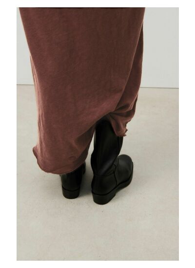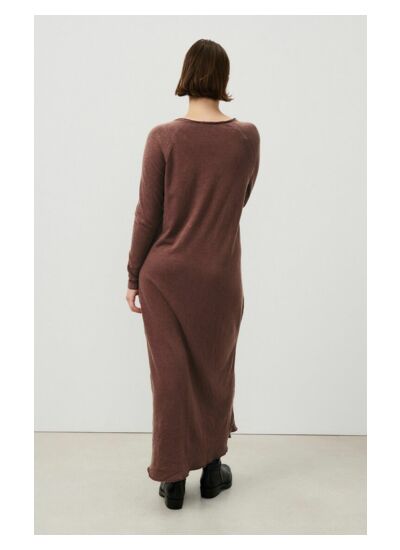 La robe présente une coupe droite et longue avec des manches longues et une encolure bateau, offrant une silhouette élégante et décontractée.