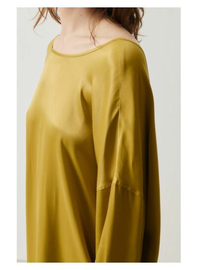 La robe présente une coupe ample et courte avec des manches longues, une encolure bateau et des emmanchures basses, offrant un style à la fois décontracté et sophistiqué.