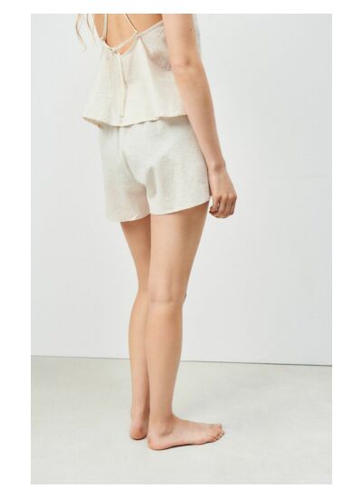 Quelle matière compose le short Ylyvow et quels sont ses avantages ? Le short est confectionné en seersucker, un tissu gaufré qui favorise la respirabilité. Cette matière légère assure une excellente ventilation, idéale pour rester au frais pendant les journées chaudes.