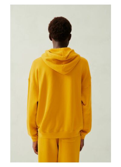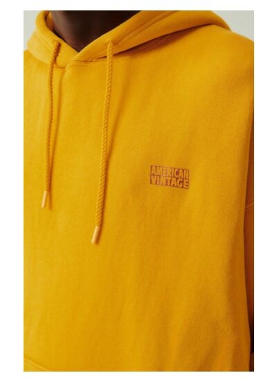 Il présente une coupe ample avec épaules tombantes, une capuche classique avec lien de resserrage et le logo American Vintage imprimé discrètement sur la poitrine pour un style moderne et intemporel.