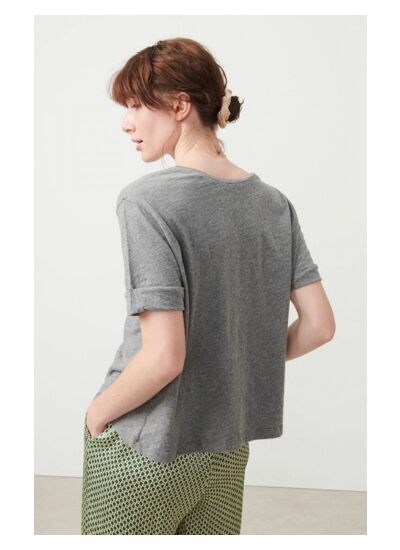 Ce t-shirt convient-il à un style casual ou plus habillé ? Sa coupe épurée et son col rond en font une pièce polyvalente, facile à associer aussi bien avec un jean pour un look décontracté qu’avec une jupe ou un blazer pour une allure plus sophistiquée.