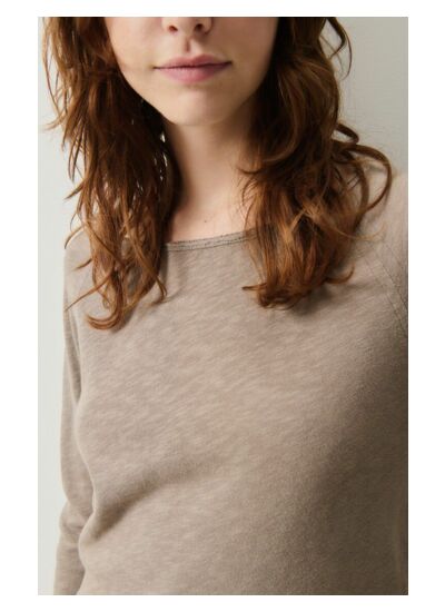 Quelles sont les caractéristiques de la coupe et du design ? Le t-shirt présente une coupe droite avec manches longues, une encolure bateau et une collerette à vif, offrant un style à la fois simple et élégant.