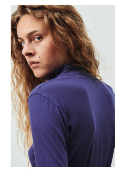 Comment porter ce t-shirt pour un style polyvalent ? Le col montant et la coupe droite permettent de le porter seul pour un look épuré ou en superposition sous une maille pour plus de chaleur et d’élégance.