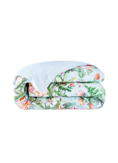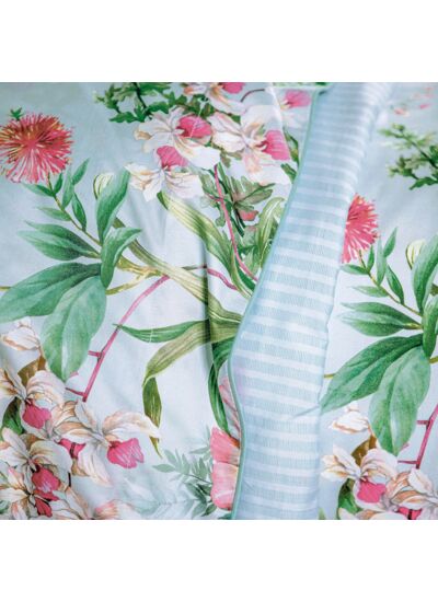 L’impression des orchidées, d’hibiscus et clématites est sublimée par le support choisi en satin 120 fils/cm² en coton issu de l’agriculture biologique.