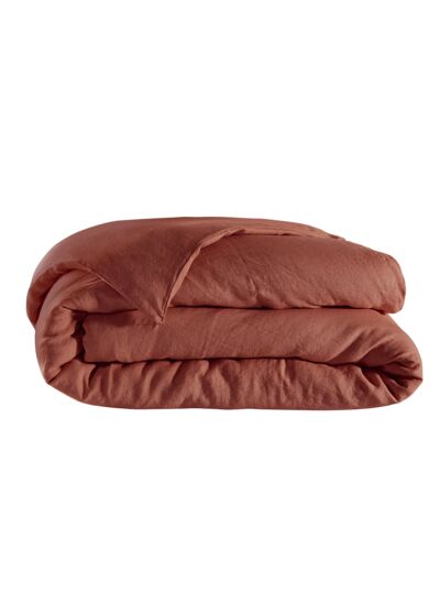 Lovez-vous avec délice sous la housse de couette LINA Terracotta en lin lavé d’origine française labellisé Europeanflax !