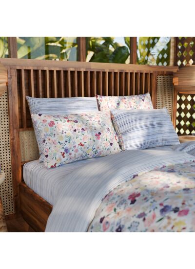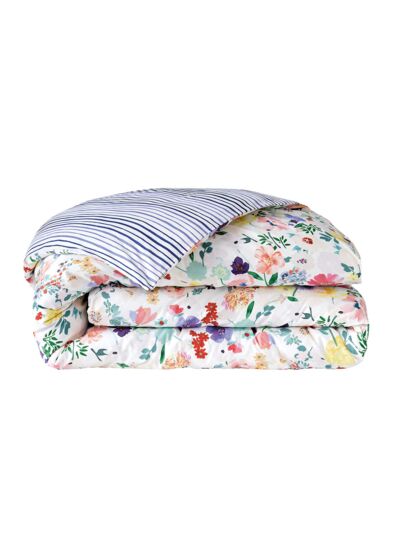 Un imprimé généreux de fleurs champêtres multicolores anime le recto de la housse de couette et répond à une rayure estivale du verso.
