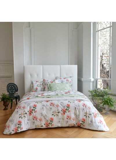 Imprimé sur une percale 80 fils/cm² 100% coton biologique, les motifs floraux de Villandry cohabitent avec un motif néo-géométrique, tels un jardin foisonnant au printemps.