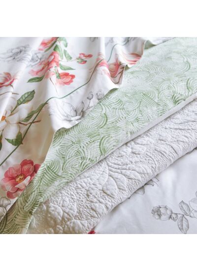 La housse de couette se couvre de fleurs multicolores sur fond blanc optique et un verso au discret motif géométrique vert, très graphique.
