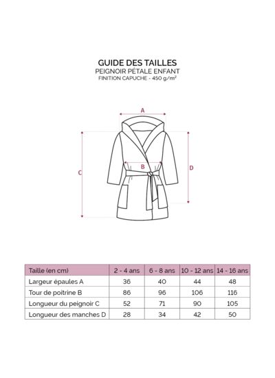 3 tailles sont disponibles : 2/4, 6/8, 10/12 ans. Rendez-vous sur le guide de taille afin de trouver celle dont vous avez besoin.