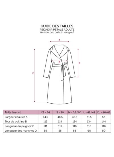 Chic et moderne avec son col châle et ses poches invisibles, il est confectionné dans une éponge 100% coton à la boucle moelleuse et confortable. Ce peignoir doté d’un excellent pouvoir d’absorption avec un grammage de 450 gr/m² sera idéal à la sortie du bain ou de la douche. Il est agrémenté de finitions extrêmement soignées qui en font une pièce d’exception.