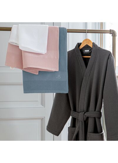 On aime le raffinement et l’élégance de cette serviette de toilette grise nid d’abeille.
