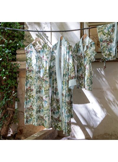 Conçue en viscose légère de 130 gr, cette liquette arbore un motif végétal exotique, créant une ambiance fraîche et délicate pour les nuits printanières et estivales.