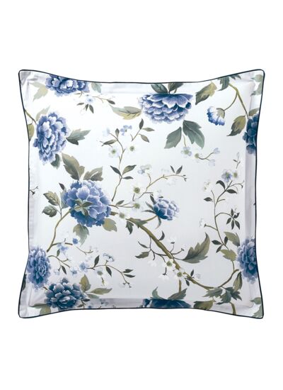 Le revers est un motif géométrique. Pour une finition élégante, la taie est confectionnée en volant plat de 3cm avec un biais bleu profond. Elle existe dans 2 tailles : 65 x 65 et 50 x 75 cm.