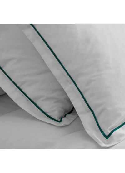 Le recto et le verso sont unis blanc. Le recto est sublimé par un biais satin au coloris vert inséré dans un volant de 4,5 cm.