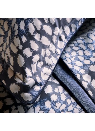 Le motif animalier dans des tonalités de la nuit un bleu marine profond, parsemé de nuances de bleus saphir et de sable offre en revers un motif plumetis qui fait penser aux peaux de cuirs de Galuchat. Un passepoil couleur marine est inséré en bout du volant de 3.5cm.