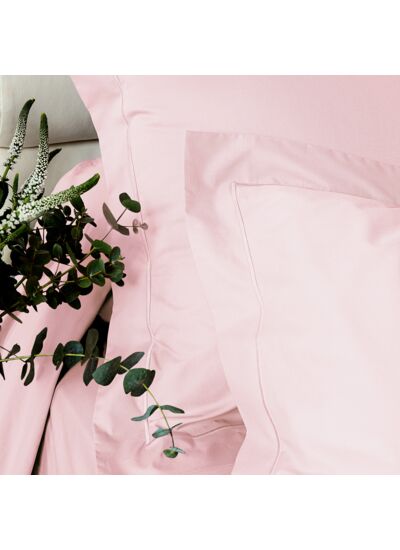 En toile de percale de longues fibres peignées, elle offre au couchage un contact doux, lisse et soyeux. D'une densité de 80 fils/cm², sa contexture lui conserve ses qualités, lavage après lavage. Un point bourdon souligne sa bordure d'un liseré. Elle dispose également d'un volant plat de 5 cm et bénéficie d'un traitement Easy Care qui fait du repassage une tâche facile et aisée.