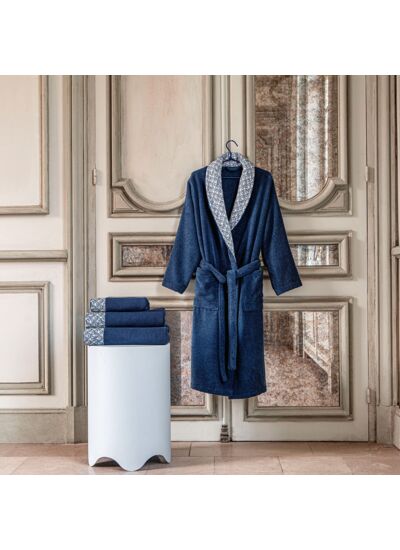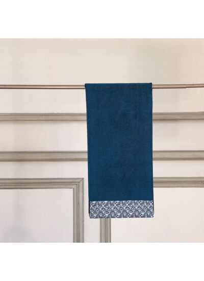 Son design élégant en bleu navy uni avec un liteau en percale agrémenté d'un motif art déco, vous transporte dans l’univers du musée de la Toile de Jouy.