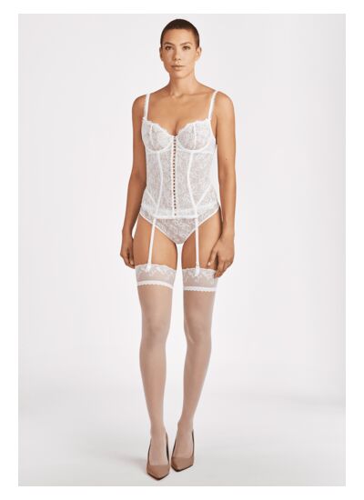 Pour Toujours, un mélange raffiné entre tradition et modernité. La broderie florale de Cornely ajoute richesse et romantisme à la ligne. Les soutiens-gorge se parent d’une fine bande de guipure ajourée, coordonnée avec les bretelles, évoquant les boutons des robes de mariée. Ce détail, lorsqu’il est placé sur les côtés ou à l’entre-seins, laisse apercevoir la peau et permet de déployer en délicatesse son pouvoir de séduction. Cette subtilité est également présente dans le dos des slips. L’un d’eux possède un dos en maille clean cut pour plus de confort. Les finitions apportées par le délicat picot élastique à la basque ajoutent un esprit vintage à la ligne, tandis que le sur-sanglage satiné renforce sa préciosité.