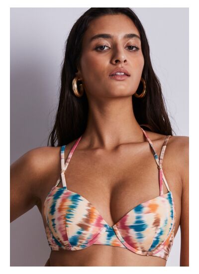 Bohème et séduisante, la ligne Mystic Soul associe un imprimé tie and dye à des détails de liens sexy dans une matière respectueuse de l’environnement. Ligne de plein été par excellence, Mystic Soul mise sur des formes sexy et légères avec des jeux de liens ornés de perles dorées. Les tonalités chaudes de l’imprimé sauront sublimer votre bronzage