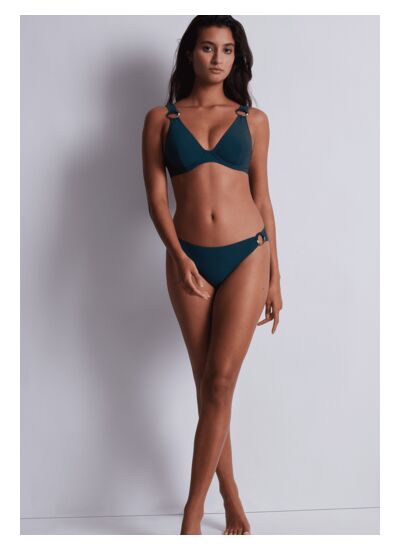 Comment ce haut de maillot met-il en valeur le décolleté ? Sa coupe triangle associée aux armatures crée un décolleté plongeant très séduisant. La matière se déploie délicatement pour habiller le décolleté sans le comprimer, offrant un équilibre entre séduction et maintien rassurant.