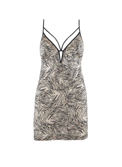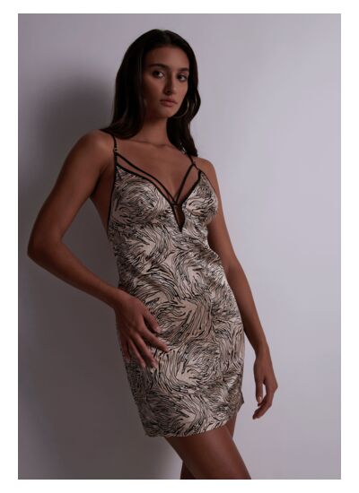 Smocky Night est une nouvelle ligne en soie imprimée dans un esprit smocking très chic. L’association de la soie imprimée avec des bandes de soie unie structure la silhouette à travers des formes modernes et élégantes. L’imprimé à l’esprit animal dans les tons nude contrastés de bandes unies noires est à la fois sexy et élégant !