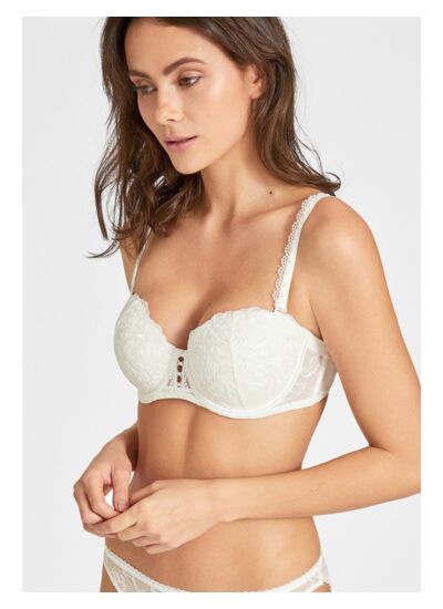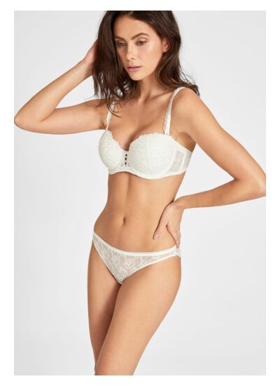 Quelle est la particularité du design de ce bandeau ? La broderie florale Cornely et la guipure ajourée placée sur les côtés et à l’entre-seins créent un jeu de transparence subtil, renforçant l’élégance et la séduction. Le picot élastique à la basque et le sur-sanglage satiné apportent une finition vintage et précieuse unique.