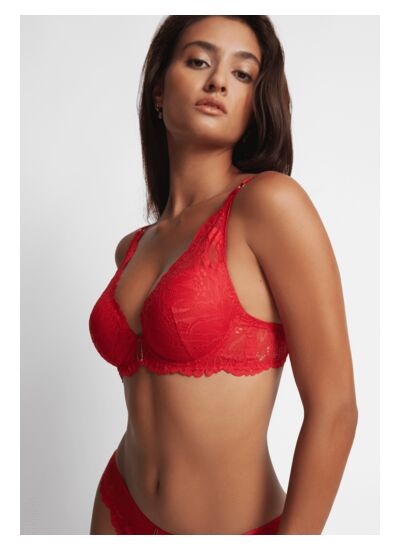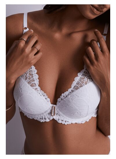 Quelle est la spécificité de la dentelle utilisée sur ce modèle ? La dentelle fine et délicate qui remonte sur le haut du bonnet met en valeur le galbe naturel de la poitrine tout en apportant une touche élégante et féminine.