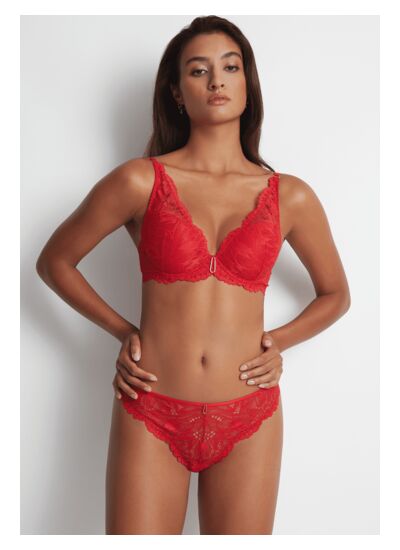 Comment le modèle Plunge foulard valorise-t-il la silhouette ? Sa forme plongeante rapproche les seins et la dentelle qui monte sur le haut du bonnet souligne élégamment le galbe de la poitrine, créant un décolleté à la fois sexy et sophistiqué.
