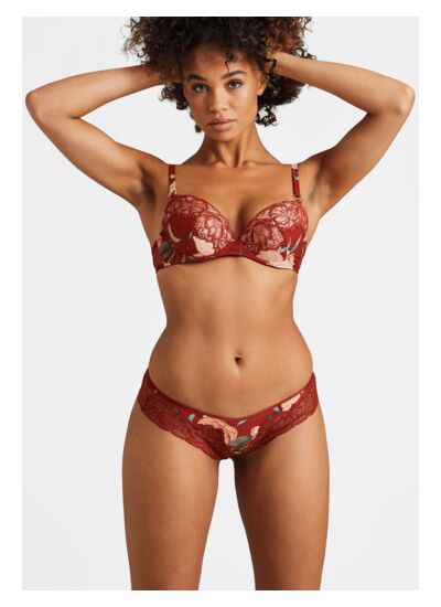 Sweet Folk vous emmène dans son univers bohême chic, où une bande de dentelle Leavers incrustée sublime un imprimé floral élégant et tendance.Un tulle plumetis met en valeur la dentelle incrustée en y apportant une touche de séduction. Un anneau doré sublime certaines formes avec sa touche de lumière. Aubade vous propose une belle offre en pièces de nuit avec le même imprimé sur un support avec un bel effet de brillance.