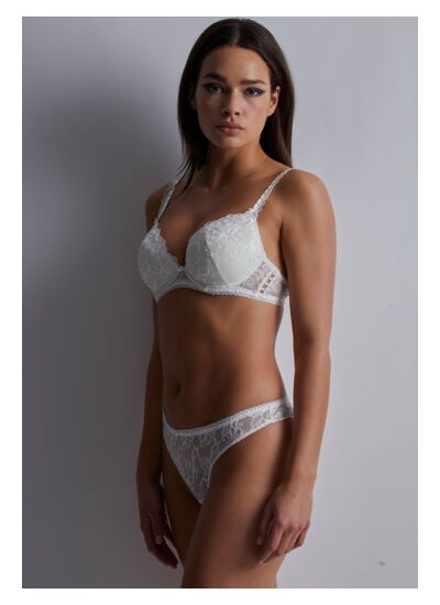 Pour Toujours, un mélange raffiné entre tradition et modernité. La broderie florale de Cornely ajoute richesse et romantisme à la ligne. Les soutiens-gorge se parent d’une fine bande de guipure ajourée, coordonnée avec les bretelles, évoquant les boutons des robes de mariée. Ce détail, lorsqu’il est placé sur les côtés ou à l’entre-seins, laisse apercevoir la peau et permet de déployer en délicatesse son pouvoir de séduction. Cette subtilité est également présente dans le dos des slips. L’un d’eux possède un dos en maille clean cut pour plus de confort. Les finitions apportées par le délicat picot élastique à la basque ajoutent un esprit vintage à la ligne, tandis que le sur-sanglage satiné renforce sa préciosité.
