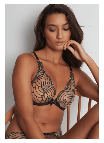 Comment ce soutien-gorge met-il en valeur le décolleté ? Sa forme triangle combinée à l’armature crée un décolleté plongeant séduisant, tandis que la matière se déploie délicatement pour habiller le buste sans comprimer, offrant un équilibre parfait entre séduction et confort.