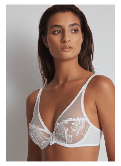 Ce soutien-gorge convient-il aux bonnets généreux ? Oui, il est conçu pour offrir un maintien optimal jusqu’au bonnet F grâce à sa forme triangle avec armatures et son dos cheminée adapté selon les tailles. Quel type de décolleté offre ce modèle ? Il propose un décolleté plongeant très séduisant qui met en valeur la poitrine tout en assurant un maintien rassurant. En quoi ce modèle se distingue-t-il des autres soutiens-gorge triangle ? Il combine la légèreté du triangle plunge avec le confort renforcé du triangle plunge confort, offrant à la fois élégance et maintien durable. La matière du soutien-gorge est-elle agréable à porter ? Oui, la matière se déploie délicatement pour habiller le décolleté sans comprimer, garantissant confort et esthétique. Ce soutien-gorge est-il adapté à un usage quotidien ? Absolument, sa conception allie maintien et confort, ce qui le rend idéal pour un port quotidien tout en sublimant la silhouette.